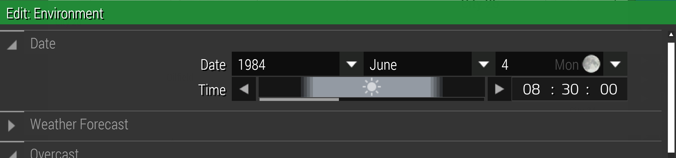 When you change dates this scale changes. Wonderful environments of ArmA 3 take real world sun / star positions into account so if your terrain latitude / longitude is on Antarctica it gets dark very early and if the terrain is on equator then day light starts very early.