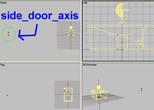 OK, that's 3 of 4. The last one is easy to make but can be tricky to configure. So far we have created axises that makes an object rotate around it. All the stuff we have made so far are for either doors that swing open, a switch that flips and a spinning radar structure. All those are rotating objects in one way or the other. But what if we want a structure to slide, like a side door on a Huey, car or doorway?