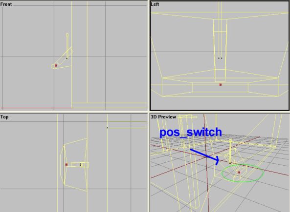 Walk up to the console and try the garage and switch animation to see if they work OK. Then make sure the side door works and that the fake linear animation trick works nice. Also, the radar should be spinning strait away. If all that seems OK, then congratulations :). If one of more of the doors seem to rotate wrong (maybe the side_door sliding the other direction), then go back in the p3d and reverse the axis (or switch the +/- signs in front of the angle1 setting for the offending animation)