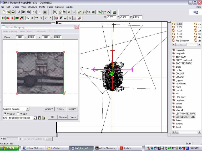 Now you see the green arrow in the gizmo window? That helps to tell where the texture is pointing. Now look in the 3d window. You want to scale down the arrow and rotate it so that the axis of the arrows in the 3d window are centered in the leg. Look at the pic to see how it was moved, scaled and rotated. To rotate, hold the cntrl key and move the mouse. To scale hold shift/cntrl and move the mouse. There are 3 pics showing this. Oh, for cylindrical wrapping of things like the leg, or a gun barrel, click the box named wrapU, and keep the dropdown box cylindric,x angle. Experiment to see what happens otherwise. The other setting are good for other things, but I haven't figured that out yet.