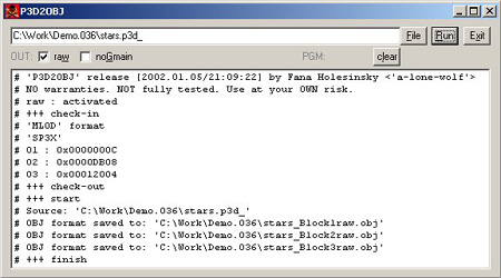 Output in OBJ (Wavefront) format can be previewed, for example, with 3D Exploration viewer (very stable with OBJ format, in comparison to some others). Any other using of OBJ file can be dangerous - for example, to modify P3D file in any hex-editor with the help of info from OBJ file!