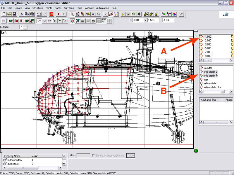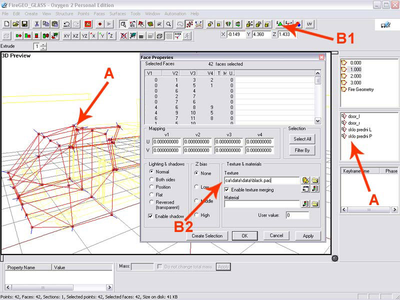 In Oxygen2 we open our model and in the Resolution LODs (A) we start naming all the glass selections (B) . We have to use the Czech names for them to work