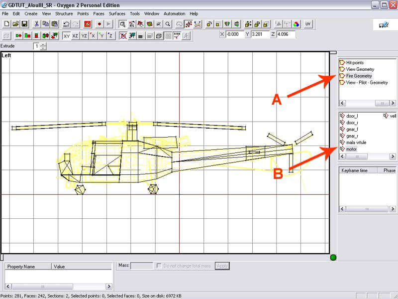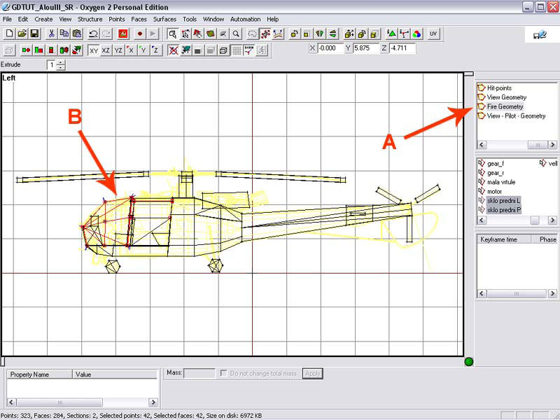 Create a Fire Geometry LOD in the Named Selections (A) and make the model with all the components (B) . The model should be simple, defining the basic model shape with important components named. Surfaces modeled in this LOD do STOP any bullet (any caliber).
