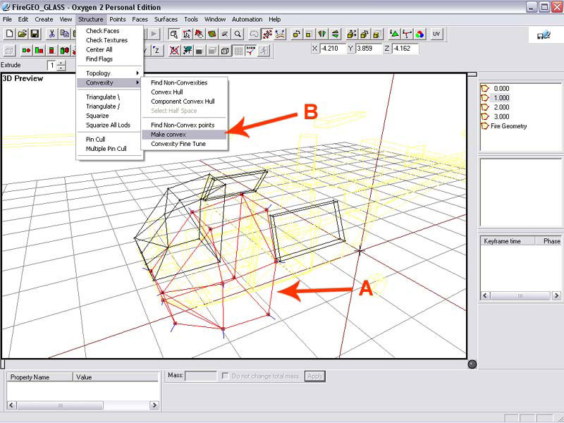Select all the components in the Fire Geometry LOD (ctrl+a) then go to (A) Structure | Convexity | Component Convex Hull and apply.