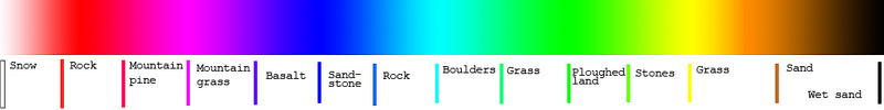 The information about the layer map above relates to tool use rather than the ArmA game engine. For game use each segment of the Layer map uses its own pallete that is unrelated to the Layer Legend mentioned above. Each terrain type within a segment uses a colour based upon the order in which the terrain types are defined in the config. Colours are used in the following order : Black (000000), Red (FF0000), Green (00FF00), Blue (0000FF). It is interesting to note SaraLite uses a maximum of 4 terrain types in any given segment. This may be an engine limitation. All 4 terrain types can be blended together within one pixel of the layer map (2m x 2m), although blending is rarely used. Ground clutter appears to be placed based upon the dominant terrain type.