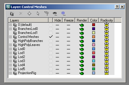 These branches should be reasonably low poly, I'd recommend about 150 tris, these will be used in the high lod of the tree model. Name the small branches 'smallBranchLod0_' and add them to the 'BranchesLod0' layer