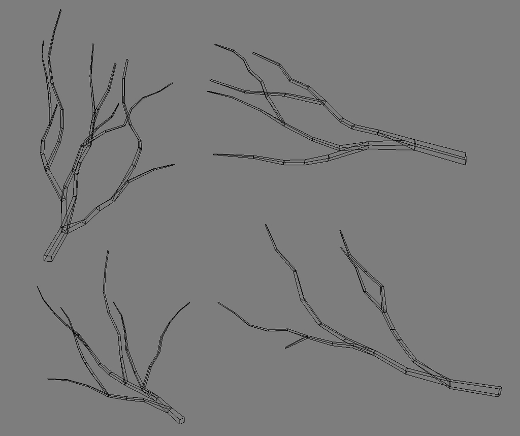 Model a variety of twigs that can be used in different ways to help make the foliage look interesting and sporadic. Be sure to study photographs of branch structures and take note of how they grow and how they might break down into smaller parts. Name the twigs, 'twig_high' and add them to the 'Control Meshes' layer, then make instances of them and add them to the 'HighPolyBranches' Layer.