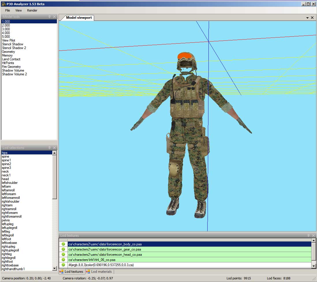 ArmA 2 P3D Analyzer is tool much like OFP ODOL Explorer, you can view ArmA 2 ODOL P3D models and even save them to MLOD format.
