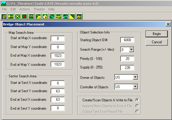 The Search Map Area dialog X and Y coordinates when readin 1023 means its 64 segment theater, if you have 128 segment theater put there 2047. Usually you want to create bridges covering whole terrain so its in range of 0-1023 for 64 segment or 0-2047 for 128 segment theaters.