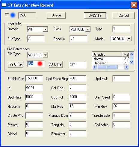 Now that we have successfully added a new vehicle entity and the two required unit entities lets dig into the the other parts of database editing that will now make the new vehicle entity perform uniquely. You might recall that when you did your add/copy of the vehicle and unit CTs - you also copied all the data that goes with the CT's you copied. Unfortunately, a lot of the data loaded into any given CT is going to need to be adjusted in some way. Further, we will need to take a detailed look at the vehicle data entry and discuss each of the database entry points, what it does, and how it relates to other parts of the database. Just as a side note, parts of the Falcon database are shared across different CTs and records - you must be aware of changes that you make because if you make a change in a record - you must ensure that it doesn't affect other records that might share the data record. This also requires the DB editor (you) to thoroughly review a record prior to editing and identify all the users, if any, of the data record. We will talk a little bit more in depth about this when we talk about squadron stores, radars and flags.