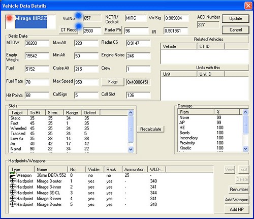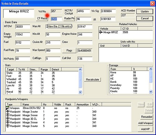 Now replace the values so that your new CTs point to the new unit and vehicle records. Once this is done you will then need to rebuild the two unit records. In the case of a/c squadrons you need to delete all the a/c entries that reference the vehicle record for the Mirage IIIE and then replace those with your new vehicle record. Next, you then need to add your new vehicle record to the the two unit records. There are different ways to accomplish this. If you use the original Falcon method, the Flight generally consists of adding the vehicle record to just the first two lines of the unit flight record. In the quantity box you can specify either 1 or 2 a/c. This will determine how many aircraft with be generated for the actual fight. So, if you want a wing man use a quantity of 2 (two) if you want to fly solo use a quantity of 1 (one).