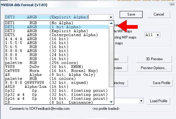 Next you have to select the output quality of the dds file. I normaly use the DXT1 with alpha option. That'll keep it nice and not to large. Remember DXT1 no alpha is low quality and DXT5 which is high quality but makes the skinfile large. Larger means more videocard memory use and more rendering time. (For my cloud skin files I used DXT5).