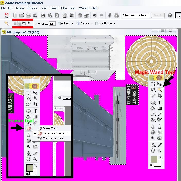 After you have selected all of the area you need to erase selected area by using the Background Eraser Tool (right clicking on the eraser tool). Erase a little part and then hitting the “delete key” on the keyboard will erase the rest of the background.