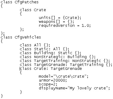 I am not going into detail about config-files. There are other tutorials out there that describes the different elements of a config file. If you happen to know a little Object Oriented Programming (like C++ or Java), you`ll notice that our Crate has been classified as an Static Building of some sort. But here are the most important stuff to us right now: