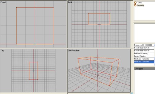 Now you will see that our crate is turned yellow. If you double click the “0.000” LOD you will see that its back to normal. Thats because our crate isn't in the Geometry-LOD but in the “0.000” LOD. But because we turned on “View background LOD” and “View bgrnd LOD in 3d view” under “File-Options” a “ghost” of our crate is being displayed in our new empty LOD, the Geometry LOD. This is useful because we need to now exactly where the original crate structure is during the next few steps. Now double click the “Geometry” LOD and lets continue. We are going to create another crate structure (only this is about 95% its size) so the OFP engine can do proper collision detection on. The reason why we have to make another crate structure for this is that Geometry LOD is invisible & therefore can`t be textured. Now lets get moving:
