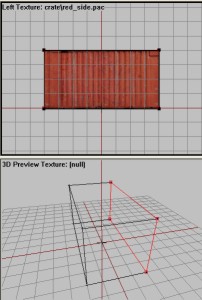 Now if everything went OK, you now have the door-textures applied. Now for the remaining 4 sides; top, bottom, right and left. If you have completed the door-texture, you should be able to apply the side-texture all by yourself. Just remember to load the red_side.pac instead of the door-texture. Select one side of the time and apply the texture. You probably need to change the view panels a little bit to make sure that you are “facing the face” you are working on. Here are some shots from the process: