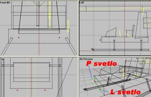 - In front view, make a copy of it (shift+move with x-axis locked) and place them equal distances from the centerline. Then select each one and call them “L svetlo” and “P svetlo”. Like this: