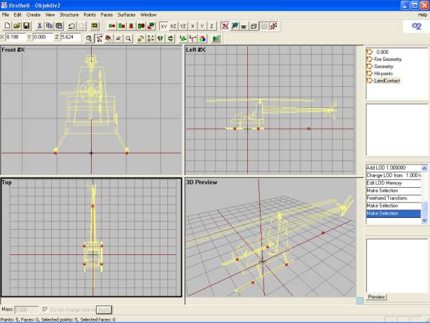 Next LOD out is LandContact and its an easy one. The name gives away its function so we`ll just do this without too much talk. The idea is to place 5 vertices beneath the heli, two under each landing gear and a fifth one at the rear center (to make it harder for the heli to tip backwards in bad landings, I think). Its very easy, just 5 vertrices on the same plane (aka use x-axis locking when crag_copying them). Its very easy to do and similar to the 4 vertices we put under the wheels of the car in lesson 2. Make a new LOD and make it “LandContact” and start placing vertrices. Here is a picture of the final placements.