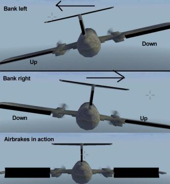 Phew, now that was a bit hard, now wasn't it? Test it and correct with axis swapping or typo hunt if you screwed up. Make sure you get it right: When a plane bank (roll) to the left, the one on your left goes up and the one on the right goes down (seen from the back). And vice versa. Also, test the air brake feature: when you hold down the back-button for some time, the ailerons should split and the top pair goes up (+90 degrees up) and the bottom pair goes down (-90 degrees down). Compare with the A10 if you are still unsure.