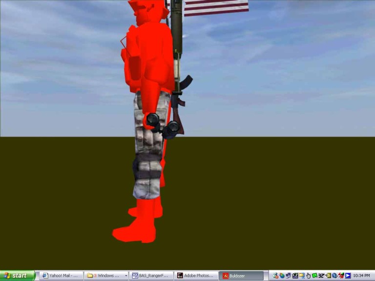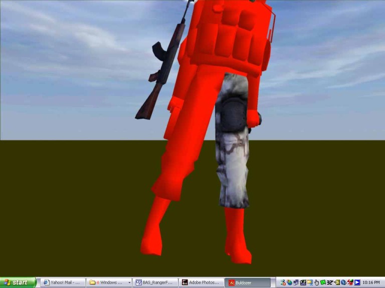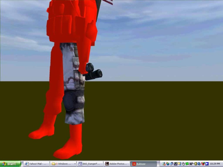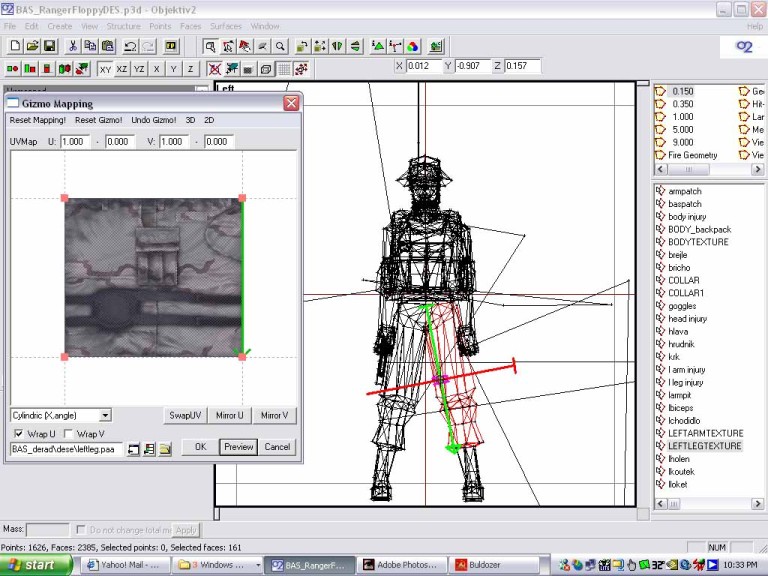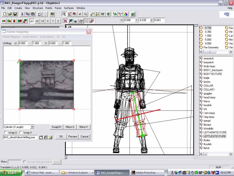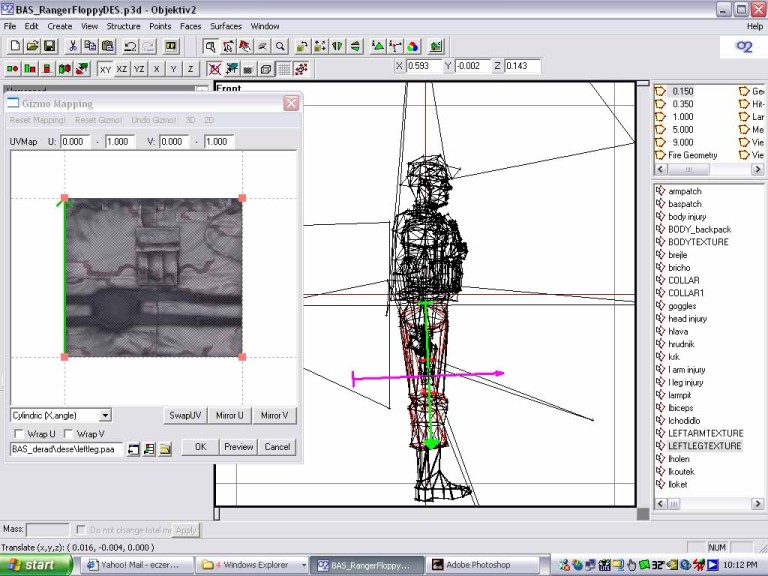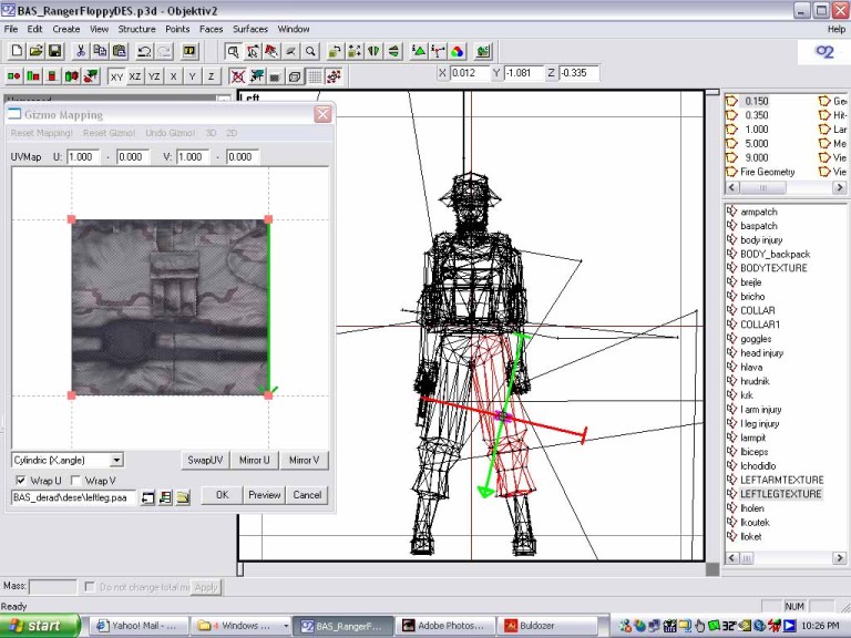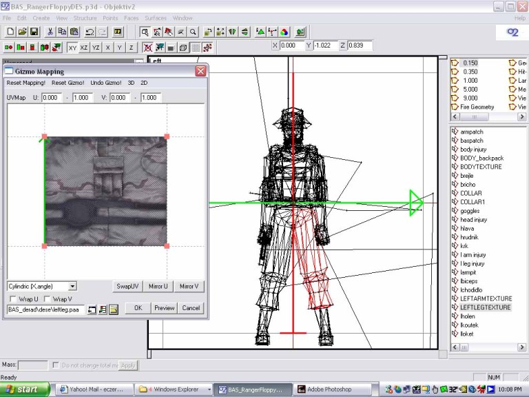 Now you see the green arrow in the gizmo window? That helps to tell where the texture is pointing. Now look in the 3d window. You want to scale down the arrow and rotate it so that the axis of the arrows in the 3d window are centered in the leg. Look at the pic to see how it was moved, scaled and rotated. To rotate, hold the cntrl key and move the mouse. To scale hold shift/cntrl and move the mouse. There are 3 pics showing this. Oh, for cylindrical wrapping of things like the leg, or a gun barrel, click the box named wrapU, and keep the dropdown box cylindric,x angle. Experiment to see what happens otherwise. The other setting are good for other things, but I haven't figured that out yet.